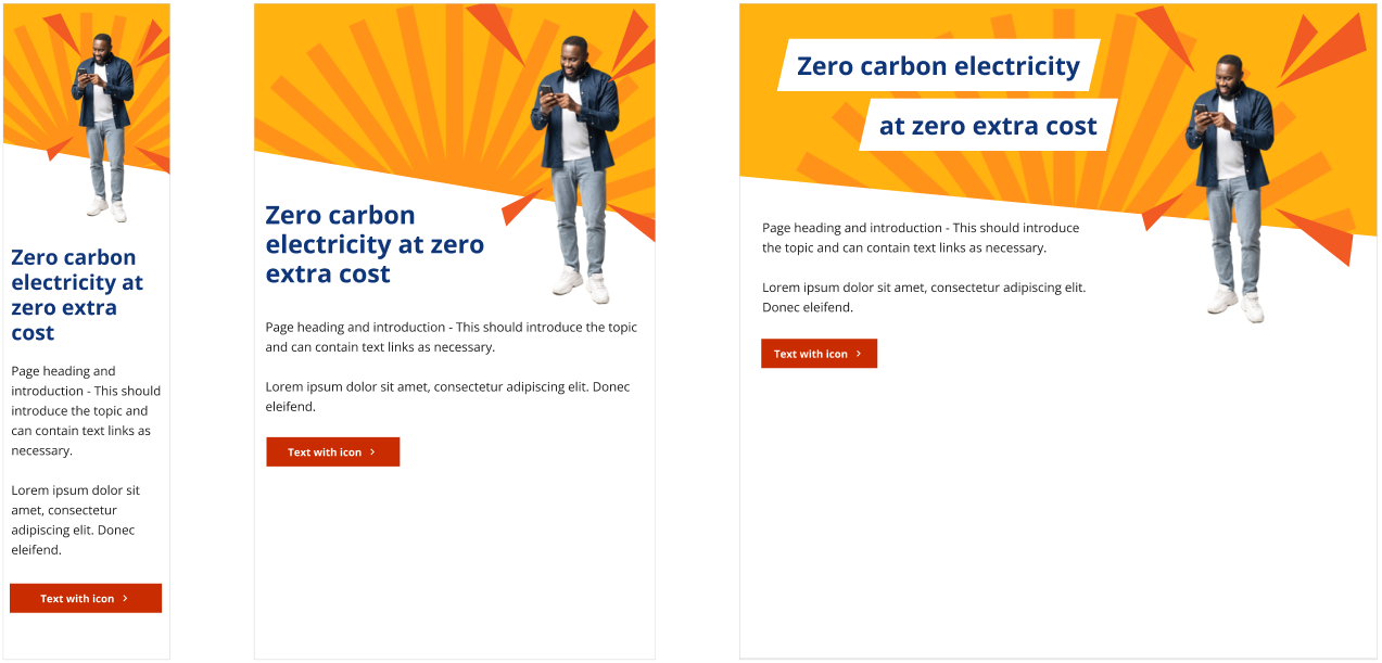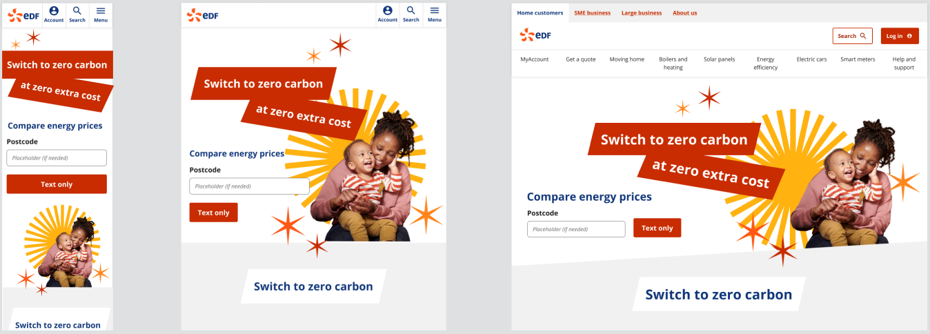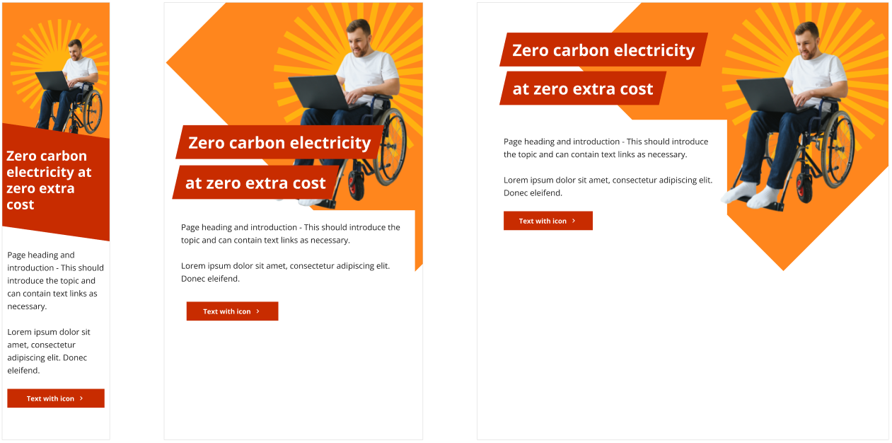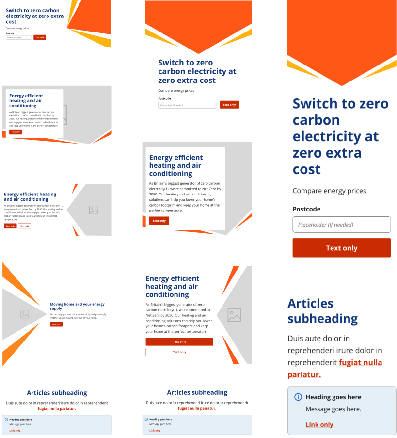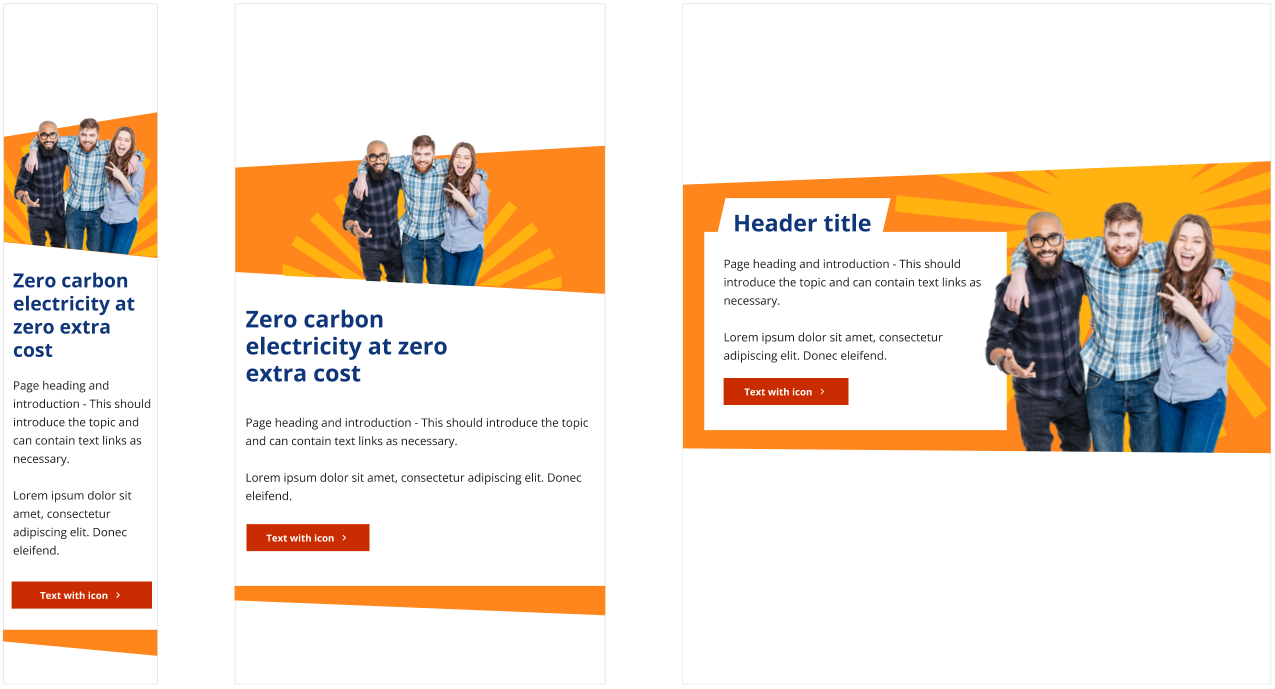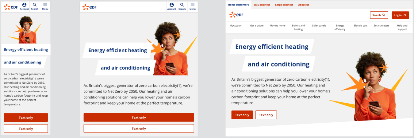 Components which work well in print don’t always translate the same way to digital. This can be due to accessibility, space or digital conventions. The block headers at angles take up a lot of space, particularly with angles and padding, and especially on mobile. These also look similar to the EDF CTA buttons, which could create confusion for the user. I tested these with the longest header we currently have to see how this would work in the worst case scenario.